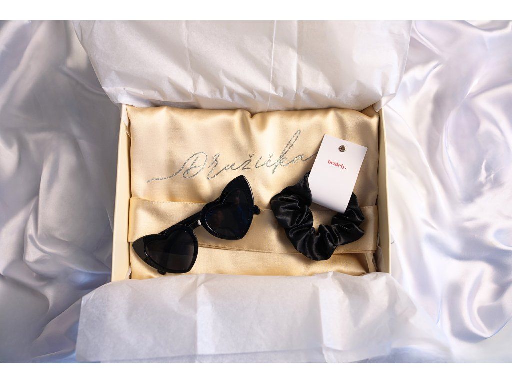Dárkový boxík pro družičku přináší sadu pro přípravu na rozlučku se svobodou nebo svatební den s elegantním a praktickým využitím. Boxík se skládá z župánku, srdíčkových brýlí a scrunchie gumičky do vlasů.