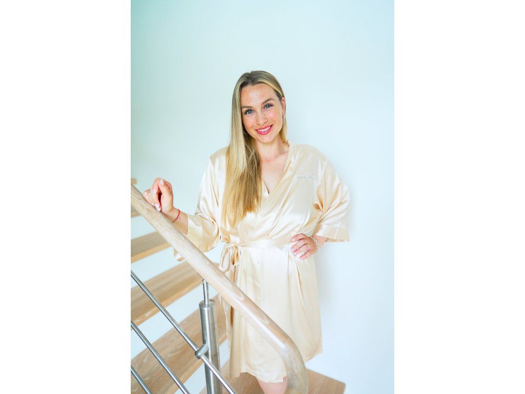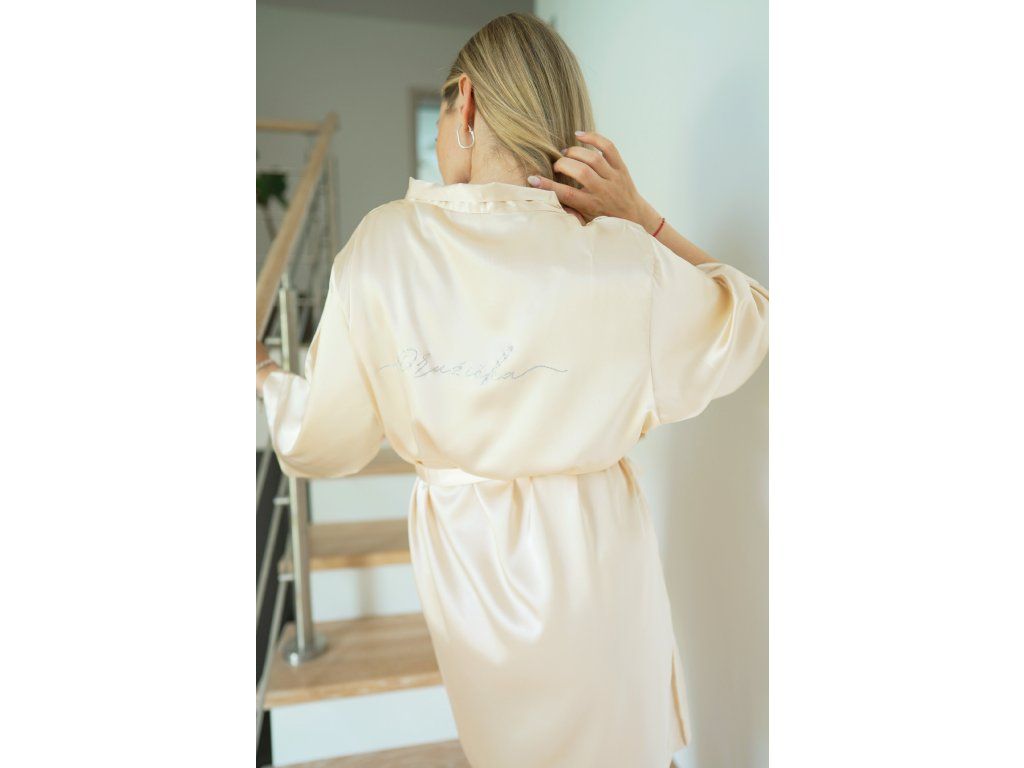 Župánek je z jemného materiálu v barvě rose gold nebo champagne, který vaší družičce poskytne pohodlí a luxusní pocit. Župánek je dodán s páskem na stažení a potištěný stříbrným nápisem družička na zádech a malým nápisem na hrudníku.