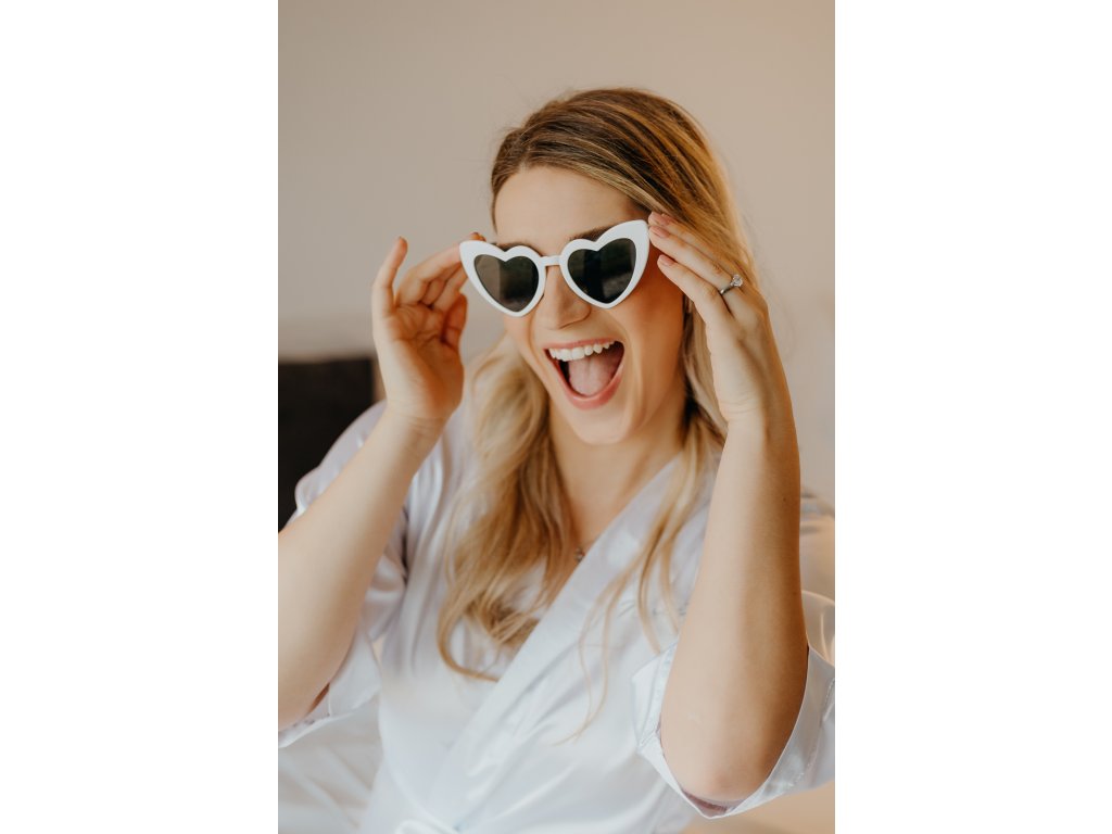 Moderní bílé sluneční brýle ve tvaru srdce, které jsou originálním doplňkem nejen každé rozlučky, ale skvěle oživí i svatební den a dodají stylový a trendy vzhled.